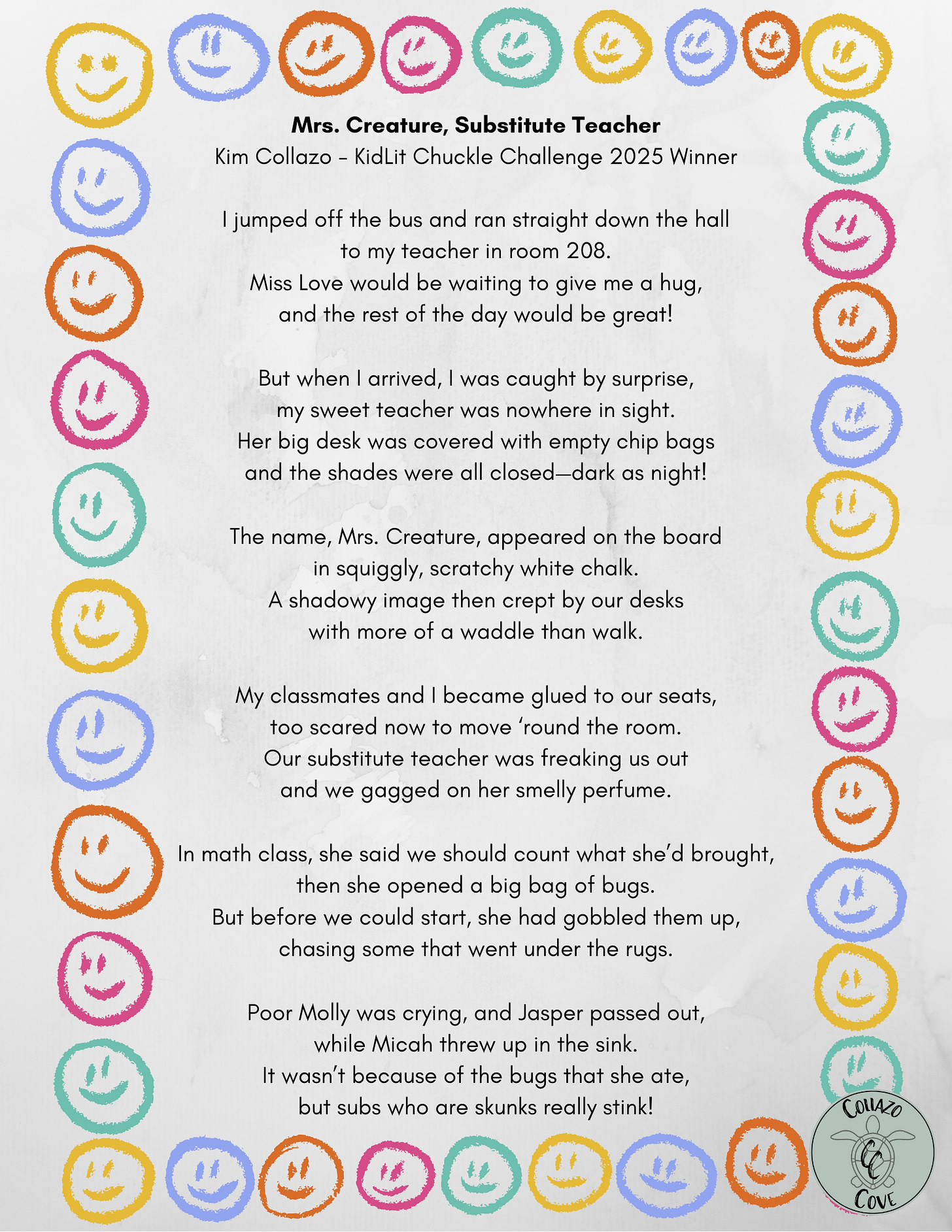 And finally, I have some fun writing news! I was a winner of this year’s Kidlit Chuckle Challenge hosted by April Berry, Bri Lawyer, Julie Hauswirth, and Kris DeCaro. In this contest, writers choose one character and one random item from the hysterical lists provided by these crazy ladies and construct a funny story using 200 words or fewer. You can read my entry below. I hope it makes you laugh!